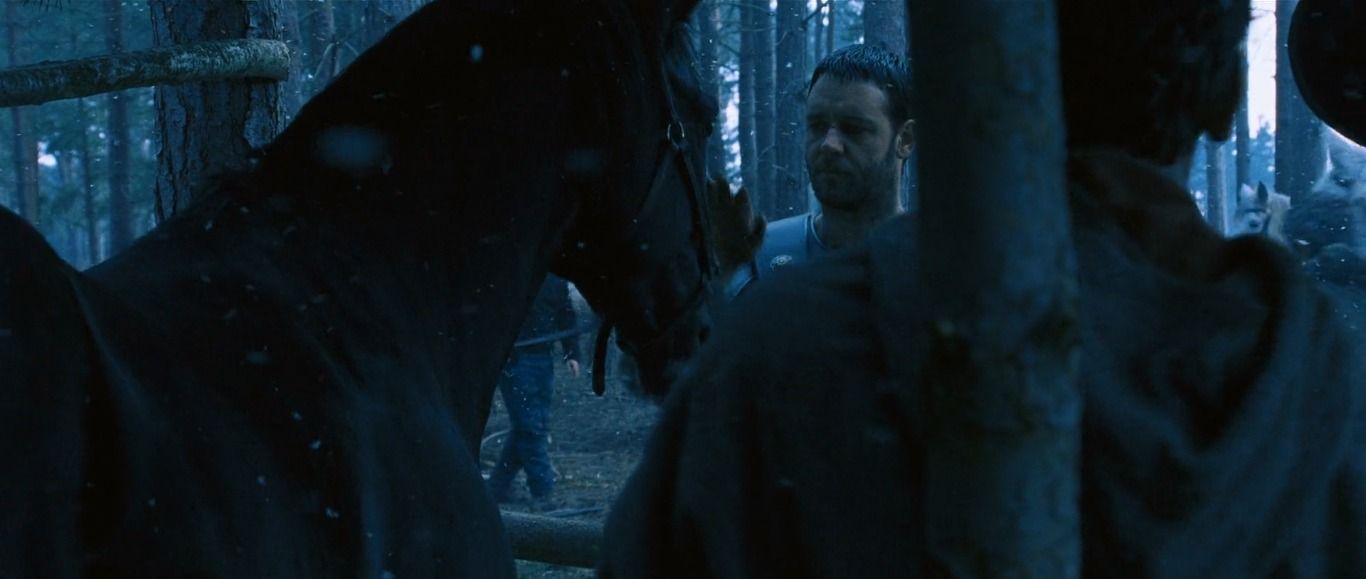 Y ojo, porque momentos raros los hay a montones. Por ejemplo, este plano, en el minuto 21:00, en el que Máximo alimenta a su caballo con una manzana y, de pronto, se puede ver a alguien vestido con vaqueros viendo la bucólica escena detrás del caballo: si piensas que en vez de gazapo es una paradoja temporal la película se vuelve muchísimo más divertida.