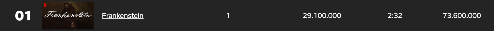 Ahora, gracias a las cifras publicadas oficialmente por parte de Netflix sobre sus títulos, sabemos que la adaptación de Del Toro de la clásica novela de Mary Shelley ha conseguido atraer a casi 30 millones de espectadores -29,1 millones de visualizaciones- en solo tres días en la plataforma de 'streaming'.