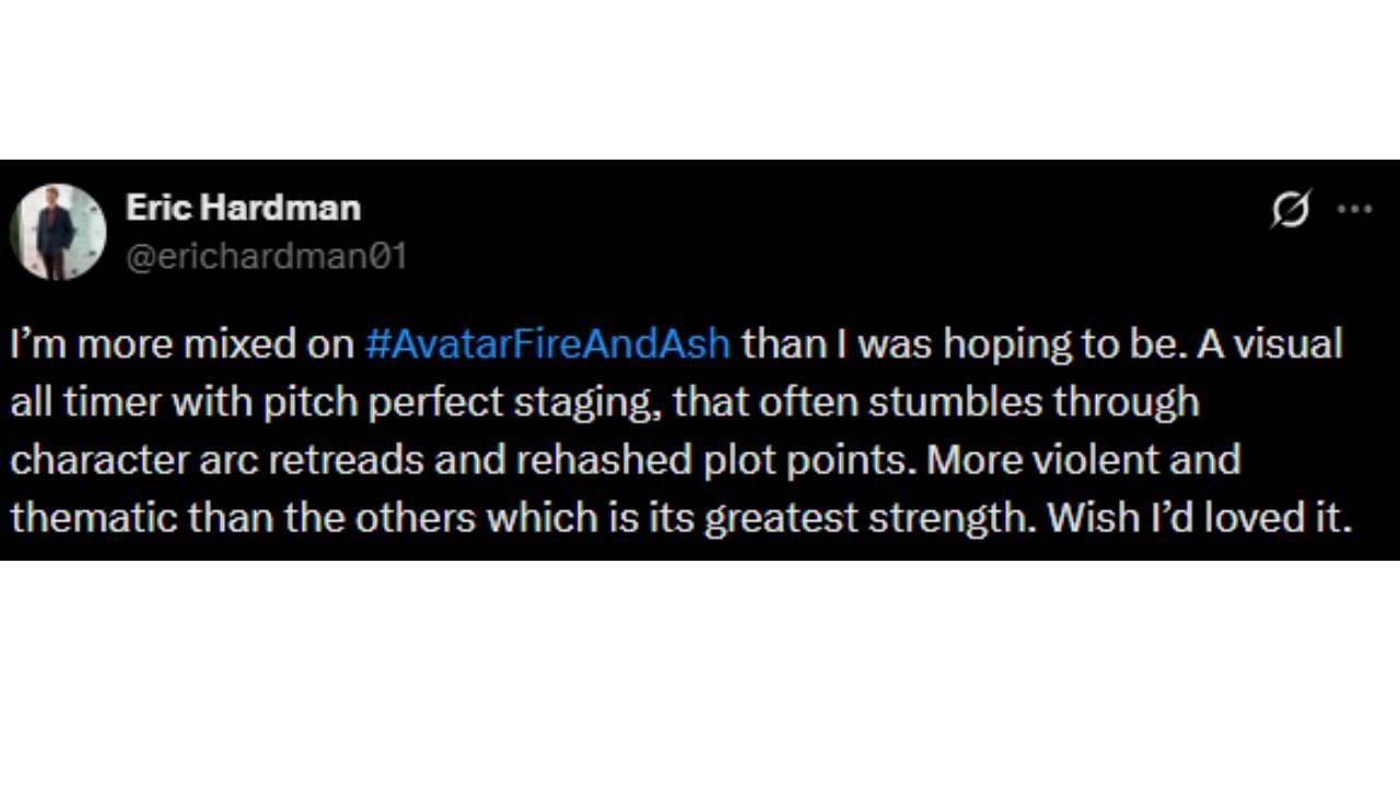 "Tengo más dudas sobre Avatar: Fuego y ceniza de las que esperaba. Un clásico visual con una puesta en escena impecable que, a menudo, tropieza con repeticiones de los arcos de los personajes y puntos de la trama. Es más violenta y temática que las demás, lo que es su mayor punto fuerte. Ojalá me hubiera encantado", afirma Eric Hardman.