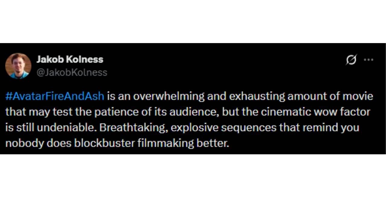 "Avatar: Fuego y ceniza es una película enorme y agotadora que puede poner a prueba la paciencia del público, pero su efecto cinematográfico es innegable. Secuencias impresionantes y explosivas que te recuerdan que no hay nadie que haga mejor películas taquilleras", cuenta Jakob Kolness.
