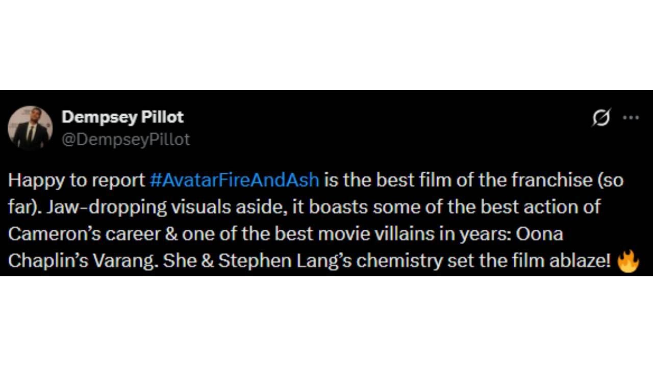"Feliz de contar que Avatar: Fuego y ceniza es la mejor película de la franquicia (hasta la fecha). Dejando a un lado sus impresionantes efectos visuales, cuenta con una de las mejores escenas de acción de la carrera de Cameron y con una de las mejores villanas de los últimos años: Varang, a quien da vida Oona Chaplin. ¡La química entre ella y Stephen Lang arrasa!", indica Dempsey Pillot.