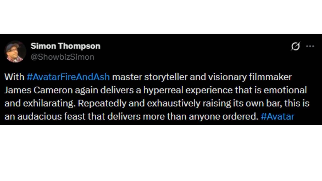 "Con Avatar: Fuego y ceniza, el maestro narrador y visionario cineasta James Cameron nos ofrece una experiencia hiperrealista, emotiva y emocionante una vez más. Elevando su propio listón una y otra vez, este es un festín audaz que supera todas las expectativas", comparte Simon Thompson.