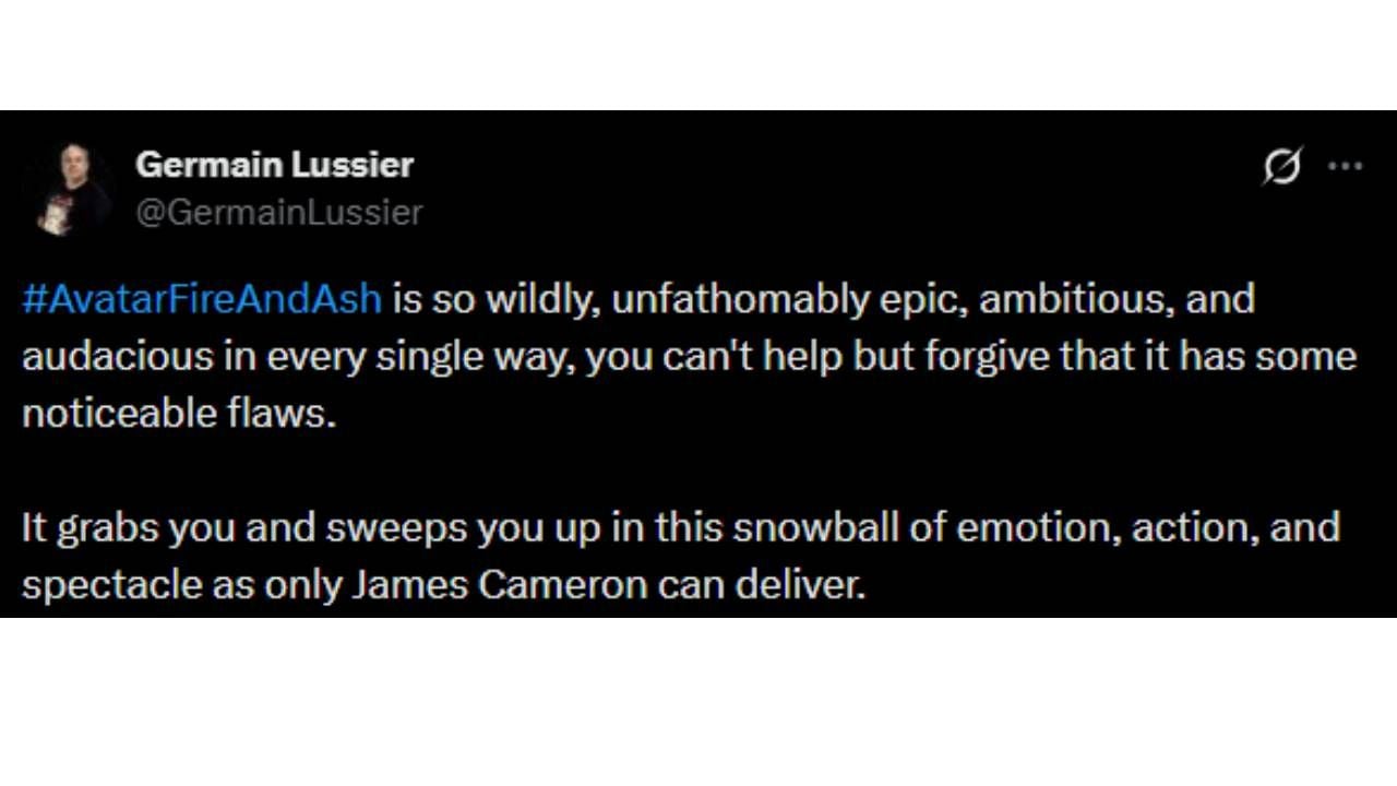 "Avatar: Fuego y ceniza es tan salvaje, insondablemente épica, ambiciosa y audaz en todos los sentidos, que no puedes evitar perdonarle que tenga algunos defectos notables. Te atrapa y te arrastra en esta bola de nieve de emoción, acción y espectáculo como sólo James Cameron puede ofrecer", dice Germain Lussier.