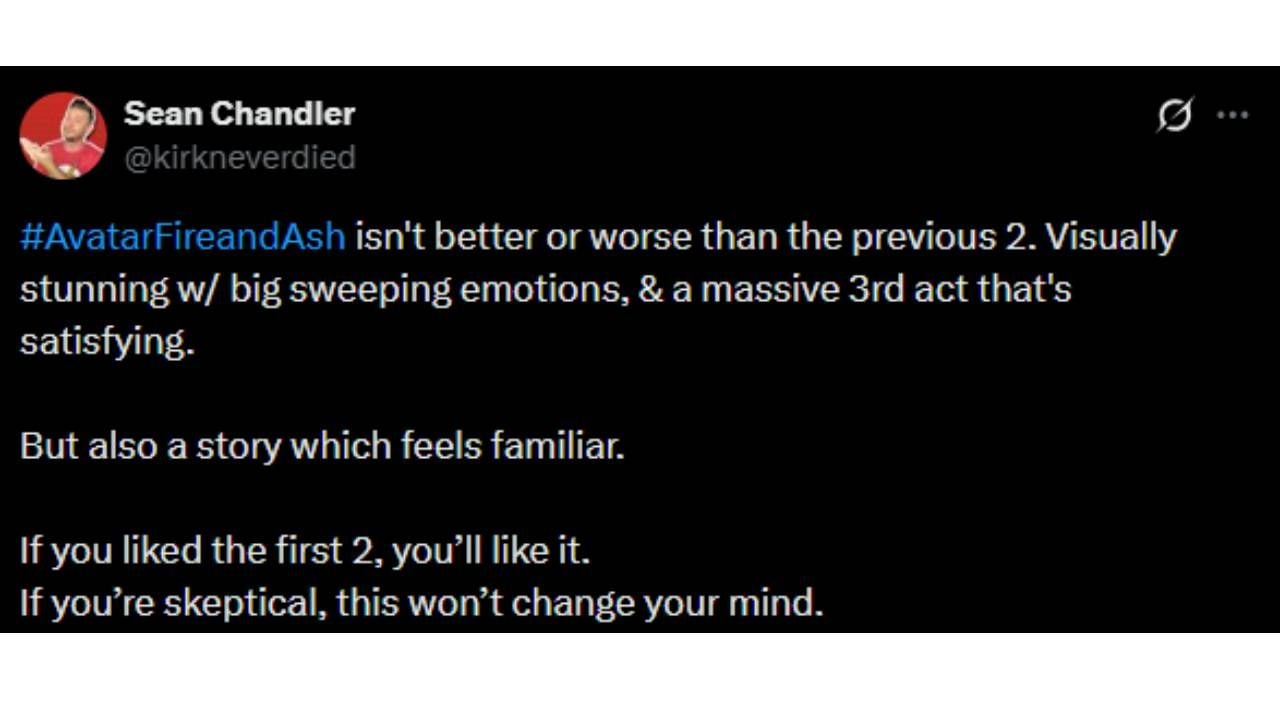 "Avatar: Fuego y ceniza no es ni mejor ni peor que las dos anteriores. Visualmente impactante, con grandes emociones envolventes y un tercer acto masivo que resulta satisfactorio, pero también una historia que nos resulta familiar. Si te gustaron las 2 primeras, te gustará. Si eres escéptico, esto no te hará cambiar de opinión", avisa Sean Chandler.