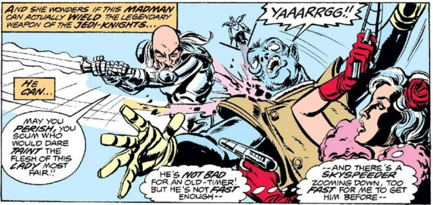 Miguel de Cervantes se hubiera llevado las manos a la cabeza si, además del Quijote de Avellaneda, se hubiera encontrado con esta versión de Don Quijote de la Mancha galáctica: un anciano convencido de que es un Caballero Jedi, con su sable láser en astillero. Sus aventuras duraron cuatro números, pero cuando volvió, en el 16, escrito por Archie Goodwin, fue para matarle definitivamente, delirando en una cama. Nunca jamás se volvió a saber de él.