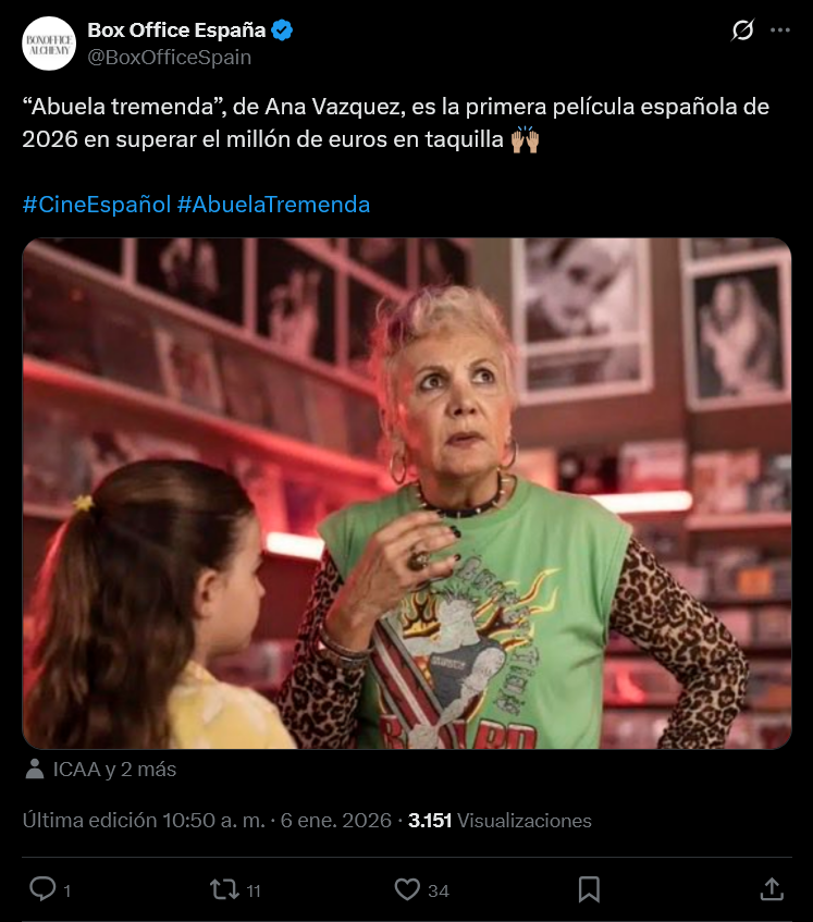 Aún está por ver si la tendencia a la baja continúa en 2026 o se recupera, pero, de momento, la primera semana de 2026 ya nos ha brindado el primer éxito español del año: Abuela tremenda, la comedia familiar de Atresmedia Cine protagonizada por Elena Irureta y Toni Acosta.