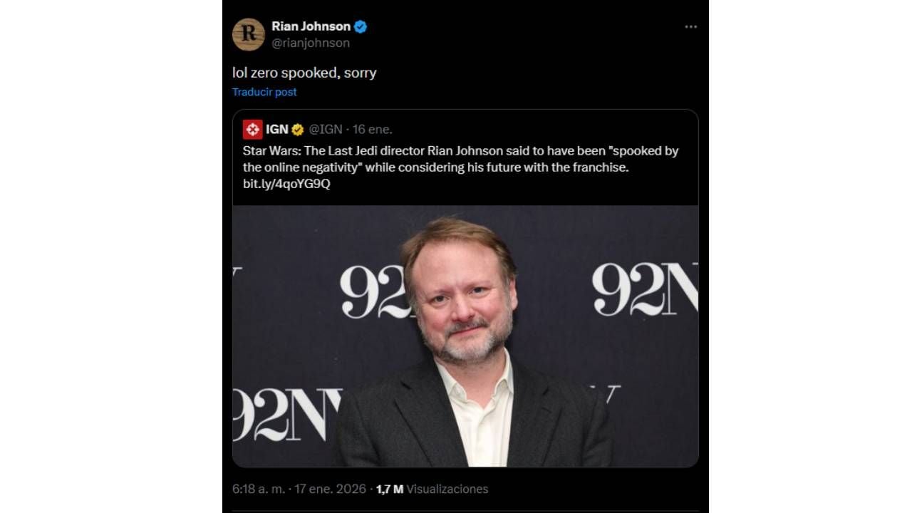 Cuando 'Star Wars' regrese a los cines, Lucasfilm será muy diferente: Kathleen Kennedy dimite tras 14 años al mandoJohnson ha reaccionado a través de Twitter a las palabras de Kennedy. "LOL cero asustado, lo siento", ha respondido.