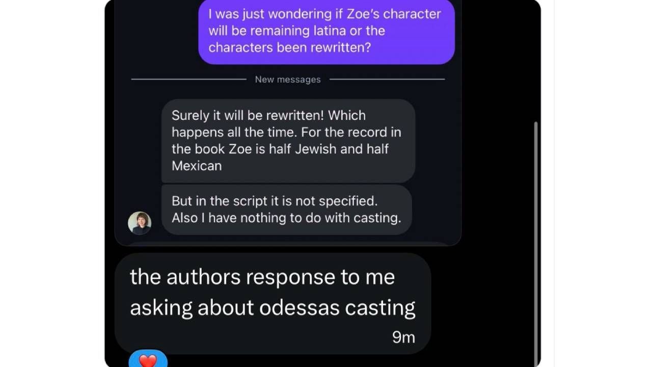No está verificado, pero una usuaria de X ha compartido una supuesta conversación con la autora de la novela: "¡Lo reescribirán!", responde sobre por qué A'zion iba a dar vida al personaje. "Ocurre todo el tiempo. Para que conste: en el libro, Zoe es medio judía y medio mexicana. En el guion no está especificado. Yo no tengo nada que ver con el 'casting".