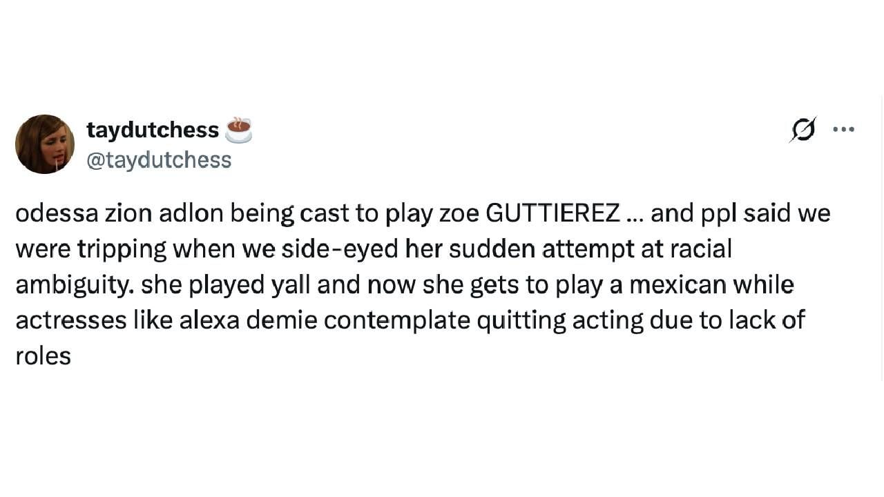 Tras conocerse la noticia, en X aparecieron comentarios como este sobre su fichaje: "Odessa A'zion Adlon elegida para interpretar a Zoe Gutierrez… y la gente dice que estábamos locos cuando vimos de reojo su repentino intento de ambigüedad racial. Jugó con todos vosotros y ahora interpreta a una mexicana, mientras que actrices como Alexa Demie contemplan dejar la actuación por falta de papeles".