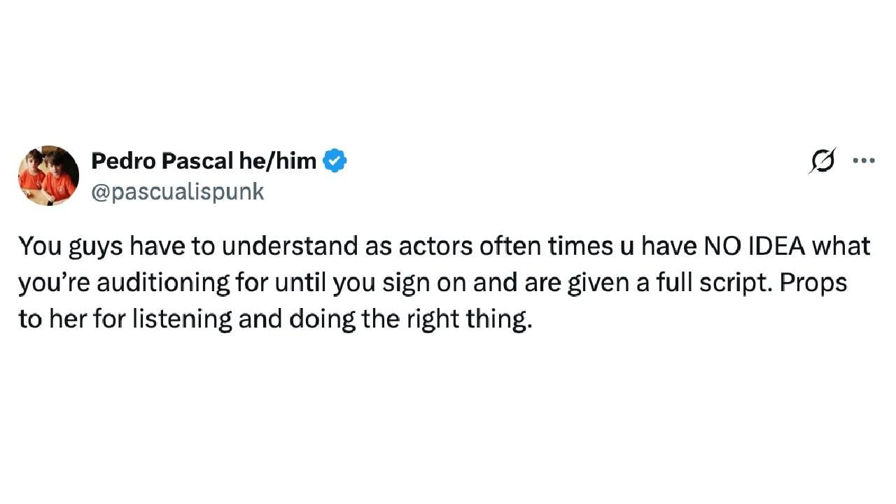El actor Pedro Pascal ha salido en defensa de la actriz en X: "Tienen que entender que, como actores, muchas veces no tienes ni idea de para qué estás haciendo el 'casting' hasta que firmas y te dan el guion completo. Felicitaciones a ella por escuchar y hacer lo correcto".