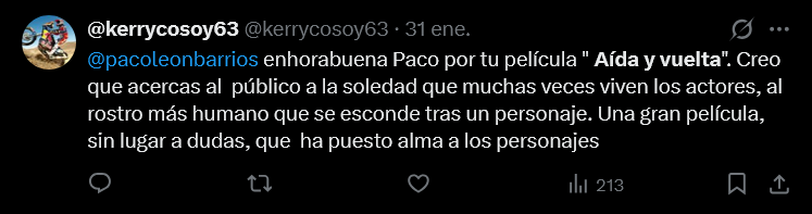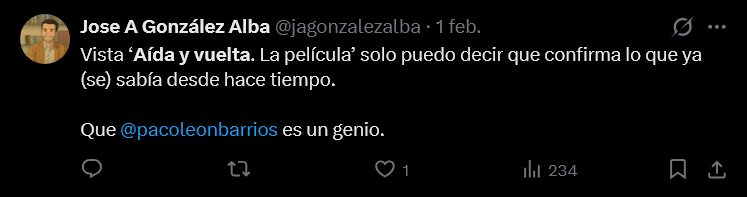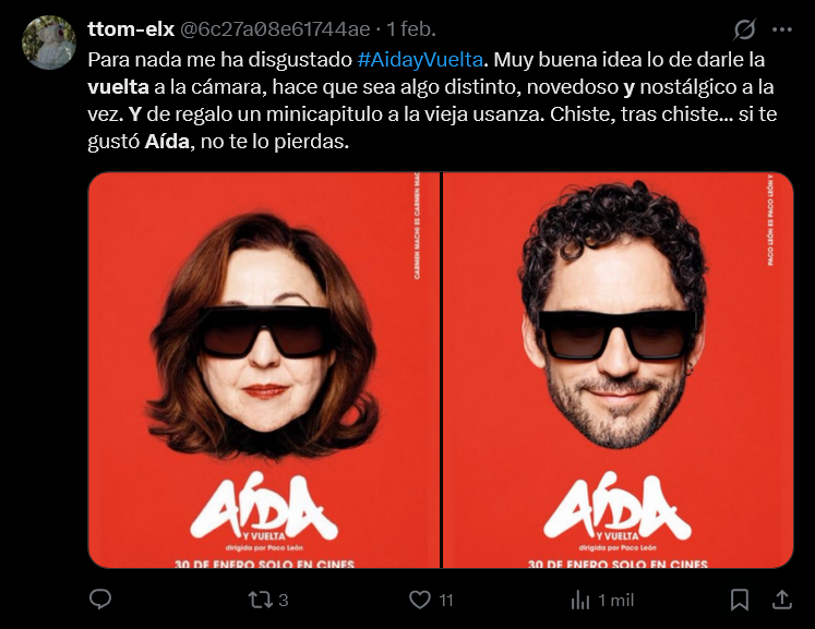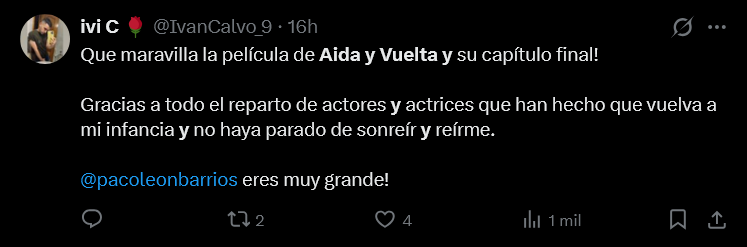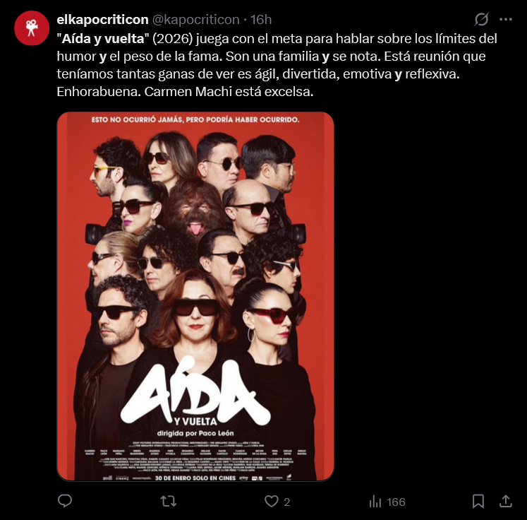 "No es Aída como tal, es una sátira brillante y muy meta: se ríe del recuerdo, del mito y de nosotros. Divertidísima, afilada y con cariño. Estamos en enero y ya va directa a lo mejor del año", escribe el usuario @hugo_snyder9. "Salgo de ver Aída y vuelta. Lo primero, qué gustazo ver una sala de cine llena. Después, cuánta inteligencia en su concepto, y qué bien dirigida. La vida misma con sus sonrisas y sus lágrimas. Y por último, aplausos en los créditos finales, que eso en un cine es oro", coincide @VMatellano.