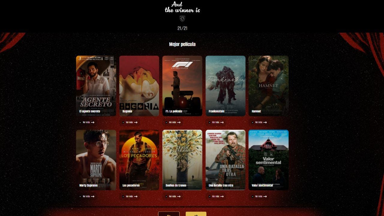 En cuanto al resto de títulos, los hay para todos los gustos. Cine bizarro (Bugonia), Blockbusters intachables (F1: La película), terror con sello de autor (Frankenstein, Los pecadores), tramas Bergmanianas (Valor sentimental), épica Hollywoodiense (Marty Supreme), cine ajeno a Hollywood (El agente secreto) y la española Sirat en la cateogría de Mejor película internacional y Mejor sonido.