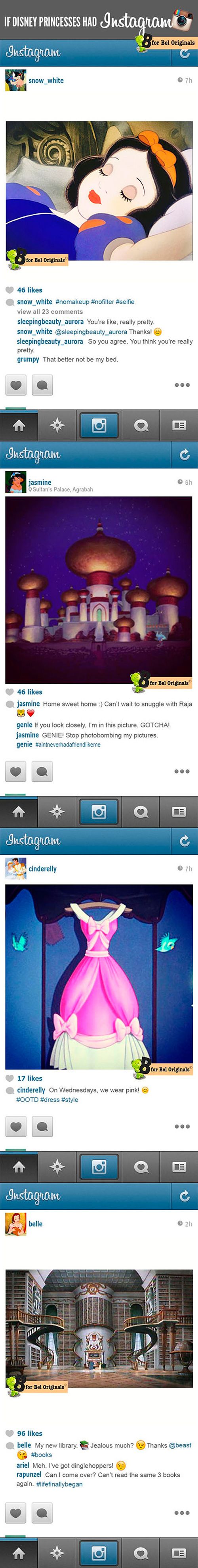 ¿Eres de los acérrimos a Instagram? ¿Más que compartir fotos del perro y de tu cena con sushi te gusta ver las imagenes que suben las celebridades a las que sigues? Es muy divertido: "¿Que están pensando?". "¿Adónde van?". "¿Qué comen?". BforBel lo sabe y va un paso más allá... hasta Disney. Si siempre has querido saber cómo sería la cuenta Instagram de una princesa Disney, aquí lo tienes.