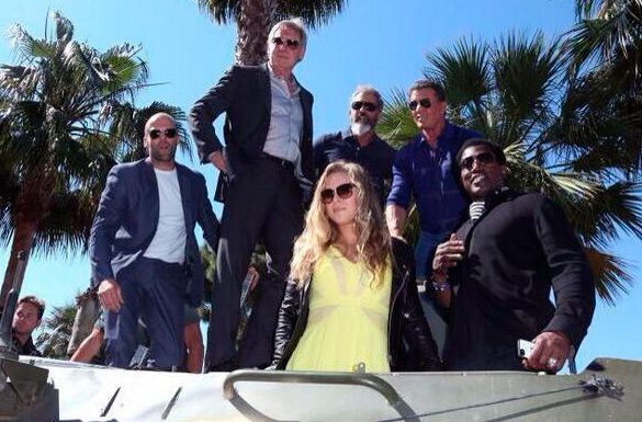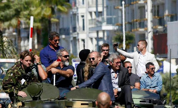 Después de ver a Jennifer Lawrence, Liam Hemsworth y Josh Hutcherson presentando en el Festival de Cannes Los juegos del hambre 3: Sinsajo Parte 1, nos llegan las espectaculares instantáneas de Sylvester Stallone y sus mercenarios en el prestigioso certamen cinematográfico. El actor quiso hacer una entrada por todo lo alto en la ciudad francesa y lo hizo subido a un tanque de guerra. Junto a él pudimos ver a Arnold Schwarzenegger, Mel Gibson, Harrison Ford (Star Wars: Episodio VII), Jason Statham, Wesley Snipes, Dolph Lundgren, Kelsey Grammer, Antonio Banderas, Kellan Lutz, Victor Ortiz, Glen Powell, Randy Couture y Ronda Rousey.