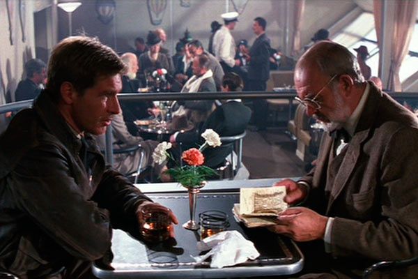 En la escena en la que Indiana Jones y su padre (Sean Connery) están sentados en una mesa en el zepelín, ni Harrison Ford ni Connery llevaban pantalones. Connery pensó que sudaría demasiado si se los ponía y a Ford le pareció una buena idea.