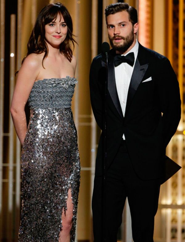 Él, con un esmoquin impecable; ella, muy atractiva con un vestido plateado de Chanel. Jamie Dornan y Dakota Johnson, los protagonistas de la película Cincuenta sombras de Grey, han derrochado elegancia durante el paseo por la alfromba roja de los Globos de Oro 2015 y también durante la entrega de premios. La cinta se estrena el próximo 13 de febrero y, después de su calificación como "R", los actores se han dejado ver por una cita tan ineludible para promocionar la adaptación de la trilogía erótica.