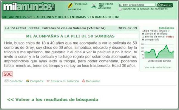 "Hola busco chica de 18 a 40 años que me acompañe a ver la película de 50 sombras de Grey", escribe el hombre en cuestión en el portal MilAnuncios.com. "Soy un chico de 36 años, simpático, educado y discreto, ley [sic] la trilogía y me apasionó. Me gustaría ir al cine a ver la película y no ir solo. Te invito a cenar y a la película y te hago regalo por solamente acompañarme. Imprescindible que ayas [sic] leído la trilogía para poder comentarla. Podemos hablar mientras, tenemos tiempo y no soy un loco trastornado".