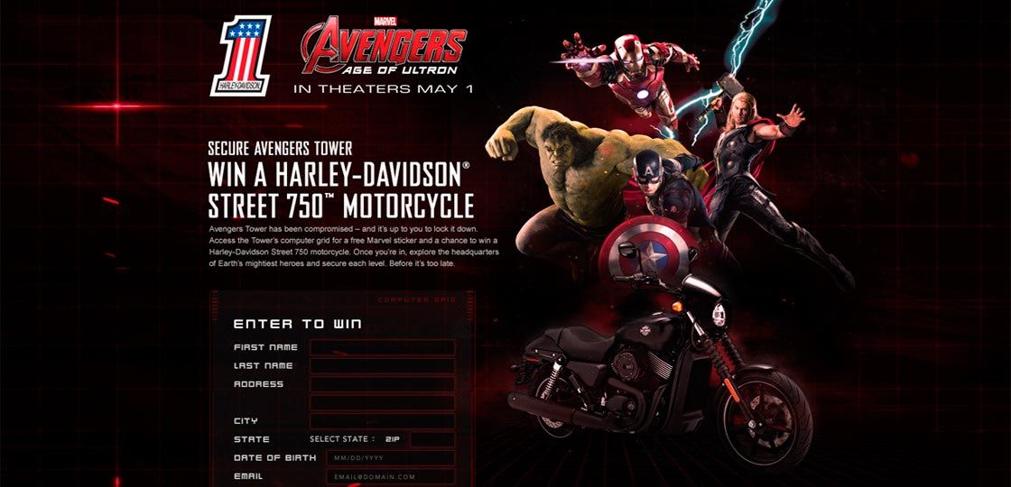 El año pasado se anunció que la primera moto eléctrica de Harley aparecería en La era de Ultrón y ahora, por fin, podemos echarle un vistazo. Además, parece que el fabricante de motocicletas hará un sorteo especial. Aún no hay nada disponible en la página web oficial, según Comic Book Movie, pero las imágenes de Hass revelan que los visitantes de la web podrán ganar una Street 750 con el minijuego Secure Avengers Tower. Habrá que esperar un poco más para enterarnos de los detalles. En las imágenes también podemos ver a los famosos superhéroes y su nueva base de operaciones.
