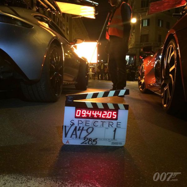 En la imagen se puede ver la claqueta de la película en medio de dos coches. El de la izquierda es un modelo Aston Martin DB10 y el de la derecha un Jaguar CX75. Los rumores afirman que el primero será propiedad de James Bond y el segundo del villano al que tendrá que enfrentarse. Según algunos de los presentes durante el rodaje, estos coches aparecerán en la escena que te detallamos anteriormente.