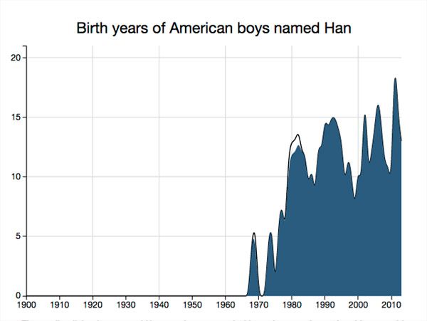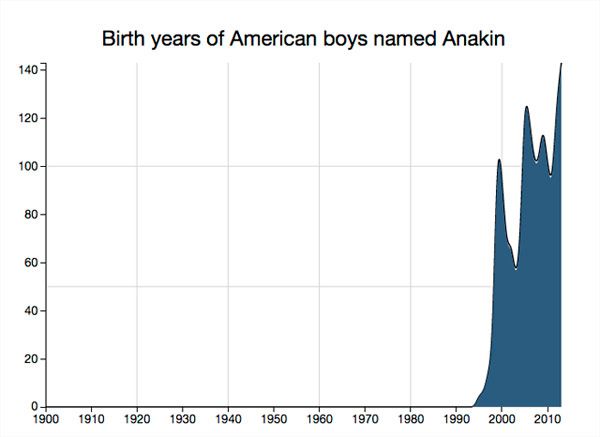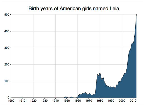 Si ya sucediera con títulos como Juego de tronos o Frozen, el reino del hielo, Hitfix señala que el nombre de Luke Skywalker vuelve a ponerse de moda. Ya despuntó en los 80, con los estrenos de El Imperio contraataca y El retorno del Jedi, y también con el estreno de las precuelas. Por su parte, el nombre de Leia Organa no era tan popular, pero ahora está superando a casi todo el resto del reparto. ¿Qué pasa con Han Solo y Annakin Skywalker? El primero no es demasiado popular, pero el segundo fue de los más utilizados por los padres, sobre todo a raíz de La amenaza fantasma. ¿Volverá con Star Wars VII?