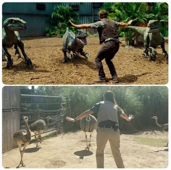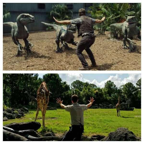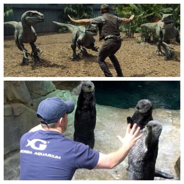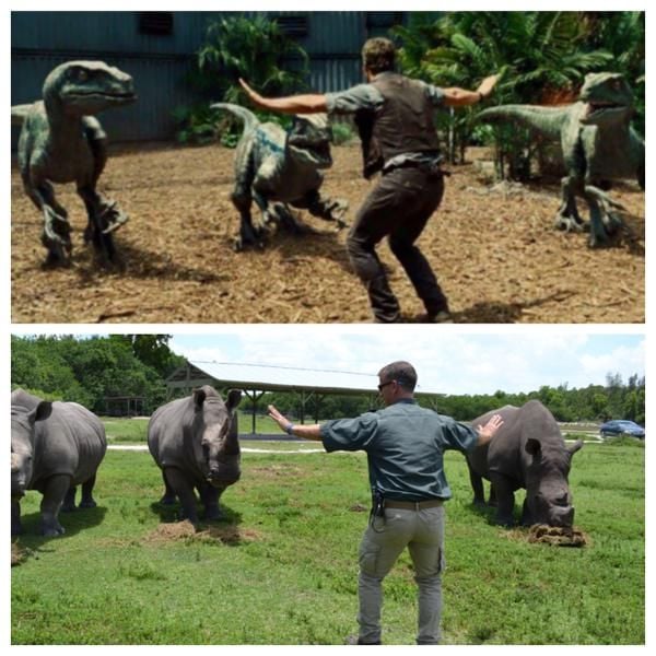 Si has visto Jurassic World seguro que recuerdas el momento en el que Chris Pratt se mete en la jaula de los velociraptores para calmarles. No sólo aparece en la película, también en los avances de la cinta dirigida po Colin Trevorrow. La pose que hace con las manos extendidas para spoiler: evitar que ataquen a uno de sus compañeros ha inspirado a varios cuidadores zoológicos y éstos han decidido fotografiarse igual que el actor, pero con sus animales.