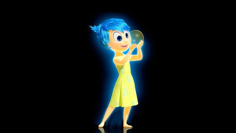 Los creadores de la película decidieron que cada emoción debía estar ligada a un concepto concreto. La alegría es una emoción unida a los beneficios y las ganancias, es decir, al positivismo. Por ello, es representada mediante una figura alegre que desprende energía y ganas de vivir. El halo azul que rodea su cuerpo es la representación de la energía de un niño pequeño, sus ganas de moverse y jugar. Además, si prestas atención durante la película, puedes percibir que esa parte azul pixela parte del cuerpo de Alegría, lo que representa la curiosidad por conocer cosas nuevas que no has visto antes.