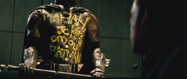 Como sabrás ['SPOILER'], Jason Todd fue asesinado por El Joker en el cómic Una muerte en la familia. Después, Jason regresa como Capucha Roja -no es la primera vez que se habla de su posible protagonismo en el Universo Cinemático DC- con ganas de vengarse de Batman, e incluso le demuestra quién y qué podría ser si estuviera dispuesto a robar unas cuantas vidas en el camino. En un plano posterior vemos el traje de Robin pintarrajeado con otro mensaje: "Hahaha the Joke's on you Batman" -algo así como "Te salió el tiro por la culata, Batman". Esta nota, sin duda, es de El Joker (Jared Leto).