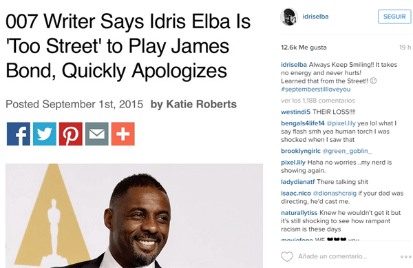 Idris Elba es uno de los actores favoritos por los fans para dar vida al agente 007 una vez que Daniel Craig lo deje. Pero este martes, el escritor de la última novela sobre James Bond, Anthony Horowitz sorprendió a todo el mundo al afirmar que Elba es "demasiado urbano" para dar vida a un personaje como este. Pese a que posteriormente se disculpó por sus polémicas declaraciones, estas volaron como la pólvora por los medios de comunicación y han llegado hasta el propio Elba, que no ha dudado en responder.