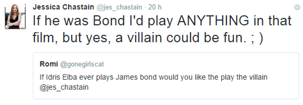 El actor ha contestado a las declaraciones, y posteriores disculpas, haciendo gala de su humor agudo: "Siempre hay que sonreír. No consume energía y no hiere a nadie. Lo aprendí en la calle". Pese a las palabras de Horowitz, muchos son los que ven en Elba el perfecto 007, un ejemplo de esto es la también actriz Jessica Chastain, que en su cuenta de Twitter no ha dudado en afirmar: "Si él es Bond, interpretaría a quien fuese con tal de estar en esa película, pero sí, una villana sería divertido".
