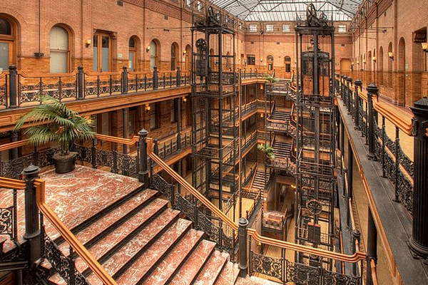El edificio Bradbury situado en 304 South Broadway, Los Angeles (California) ha aparecido en Blade Runner, Más fuerte que la ley, Arma letal 4, The Artist, 500 días juntos, Cadena de favores, Yo, el jurado, Préstame tu marido, El hombre indestructible, Las rocas blancas de Dóver, Un detective barato o La ley de Murphy.