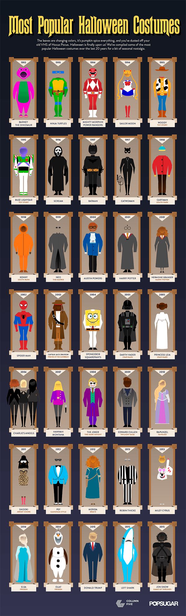 El 31 de octubre se acerca y, por si no has pensado en qué disfraz te pondrás para Halloween, los chicos de Pop Sugar han reunido en una sola infografía los más utilizados, año por año, durante los últimos 22. Por ejemplo, Las Tortugas Ninja causaron furor en 1993, coincidiendo con el estreno de Tortugas Ninja III. Lo mismo les pasó a los Power Rangers en 1994, menos de un año después del estreno de su serie televisiva.