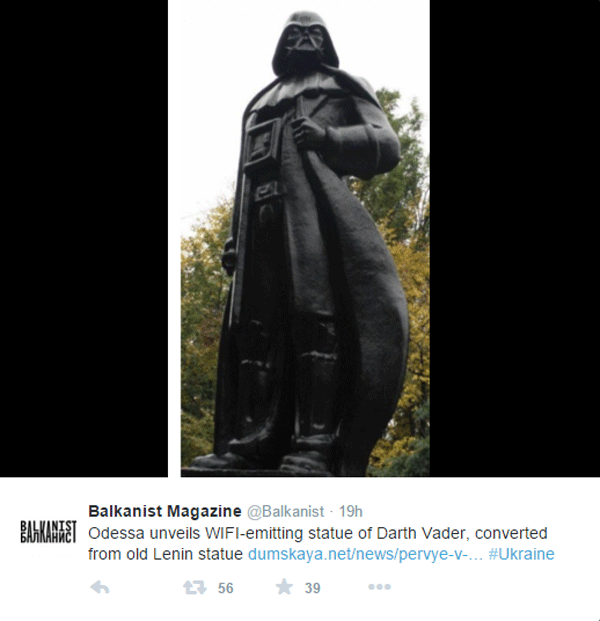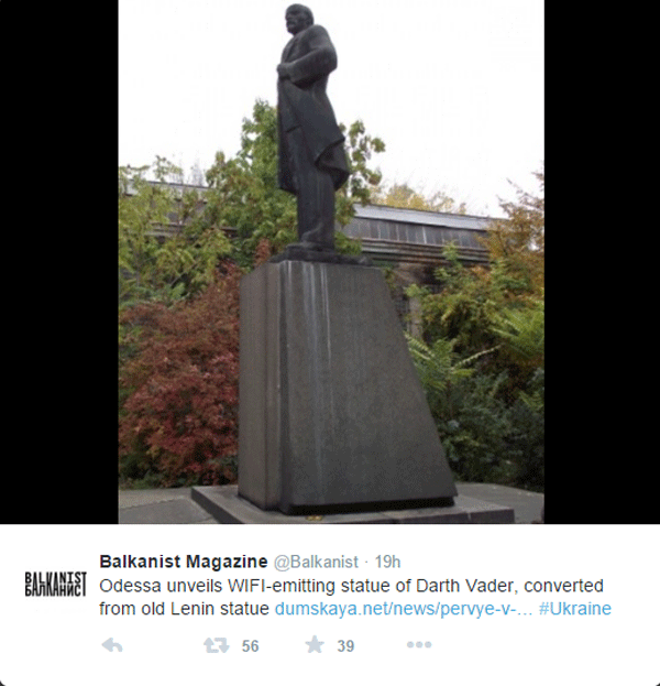 Recientemente, se ha aprobado una nueva ley en Ucrania que exige quitar todas los recuerdos de la era comunista que estén situados en lugares públicos. Por ello, esta estatua, junto con muchas otras, debía ser destruida, para evitar esto, un artista local fue contratado para modificarla y así evitar su demolición. ¿Qué te parece el cambio? ¿Aún no has visto el tráiler de Star Wars: El despertar de la Fuerza?