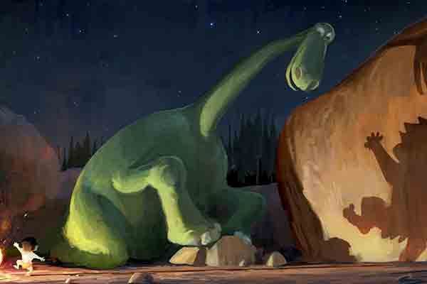 El viaje de Arlo llevaba largo tiempo siendo una tarea pendiente para el estudio, y durante bastantes años fue conocida simplemente como el “Proyecto sin título con dinosaurios” de Pixar. En un principio, el director iba a ser Bob Peterson (Up), y la trama era muy diferente: Arlo era un dinosaurio adulto, el niño hablaba, y la aventura se centraba más en las vivencias de una comunidad que en la aventura de dos llaneros solitarios. Cuando Pete Sohn se hizo finalmente con las riendas del proyecto quiso volver a la idea de partida y reescribirlo todo, estimulado por el hecho de que la película fuera prácticamente muda.
