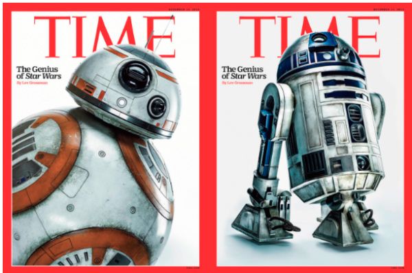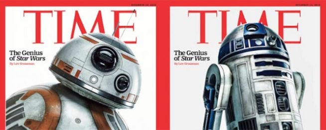 Con motivo del inminente estreno de la que es, sin duda, la película más esperada del año, la prestigiosa revista Time ha colocado en la portada de su último número a dos icónicos personajes que aparecerán en Star Wars: El despertar de la Fuerza. En lugar de recurrir, sin embargo, a alguno de los veteranos actores de la trilogía original que vuelven para esta película, o a algún miembro más juvenil del reparto, la publicación se ha decantado por R2-D2 y BB-8, los entrañables droides astromecánicos.