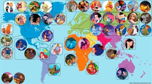 Disney ha estado presente en nuestros hogares durante décadas, lo que ha dado lugar a historias y personajes de diferentes partes del mundo. Mulán, Tiana, Blancanieves, Ariel... Ninguna de ellas proviene del mismo lugar, ¿sabrías decir en qué país o continente se desarrolla cada película del estudio? Para ayudarte, el usuario de Deviantart Theantilove elaboró hace un tiempo este mapamundi de nuestros protagonistas preferidos. Pulsa aquí para verlo en grande.