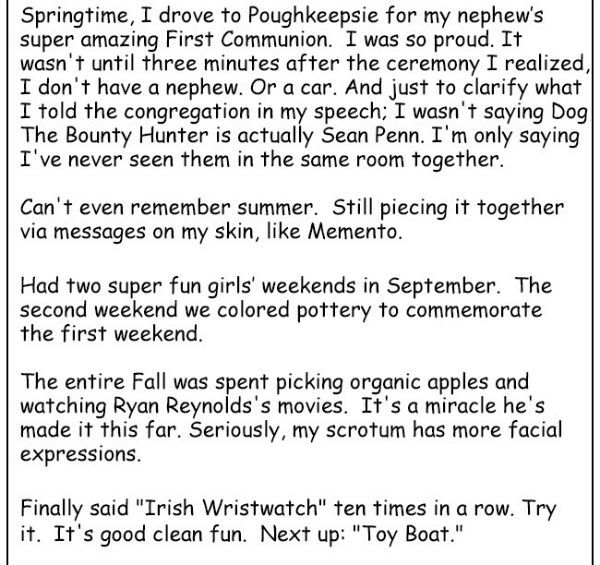 En primavera conduje hasta Poughkeepsie para la súper alucinante comunión de mi sobrino. Estaba muy orgulloso. No fue hasta tres minutos después de la ceremonia cuando me di cuenta de que no tengo sobrino. O un coche. Y, solo para clarificar lo que le dije a la congregación en mi discurso, no estaba diciendo que Dog, el cazarrecompensas es en realidad Sean Penn. Solo digo que nunca les he visto a los dos juntos en la misma habitación.