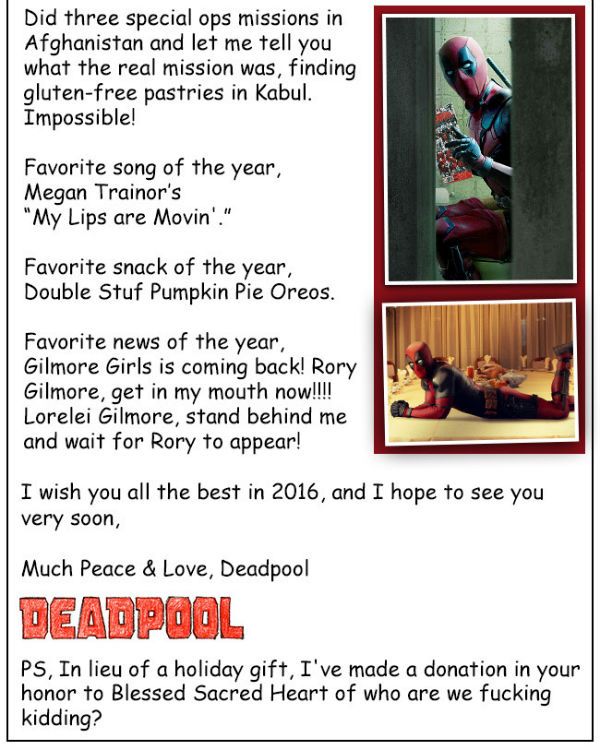 Deadpool, la película basada en el antihéroe de Marvel y protagonizada por Ryan Reynolds, se estrena el 19 de febrero de 2016 y, después de enseñarte el nuevo póster del personaje con un estilo muy hogareño, ahora el protagonista quiere felicitarte el año 2016 con esta gamberra y divertida tarjeta: