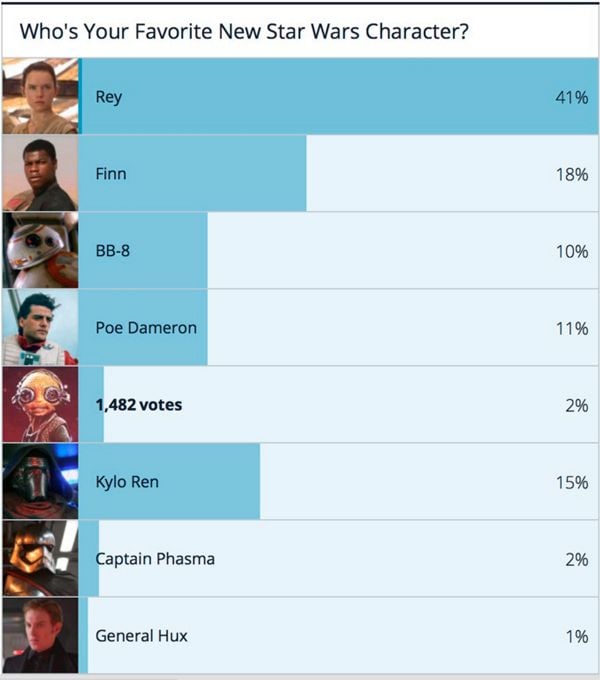 Star Wars: El despertar de la Fuerza se estrenó el pasado 18 de diciembre trayendo consigo a nuevos personajes que lucharán por hacer olvidar a los clásicos Han Solo, Chewbacca o Leia. Pero, ¿quien crees que es el nuevo personaje favorito de la audiencia? El portal Rotten Tomatoes ha elaborado una encuesta para conocer la opinión de la gente y ha sido Rey quien se ha ganado el corazón de todos los fans en el Episodio VII de La Guerra de las Galaxias, tal y como se muestra en la siguiente imagen:
