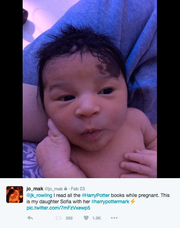 J.K. Rowling, la autora de la célebre saga de libros de Harry Potter, ha felicitado a una fan de la saga que ha tenido un bebé con un antojo en la frente. Jo Mak, una publicista de Toronto, ha escrito a Rowling a través de Twitter con el siguiente mensaje: "Leí todos los libros de Harry Potter cuando estaba embarazada. Esta es mi hija Sofia con su #marcadeharrypotter". La pequeña tiene un antojo en la frente y, si te fijas bien, lo que parece ser un pequeño rayo, parecido al de la cicatriz del joven mago.