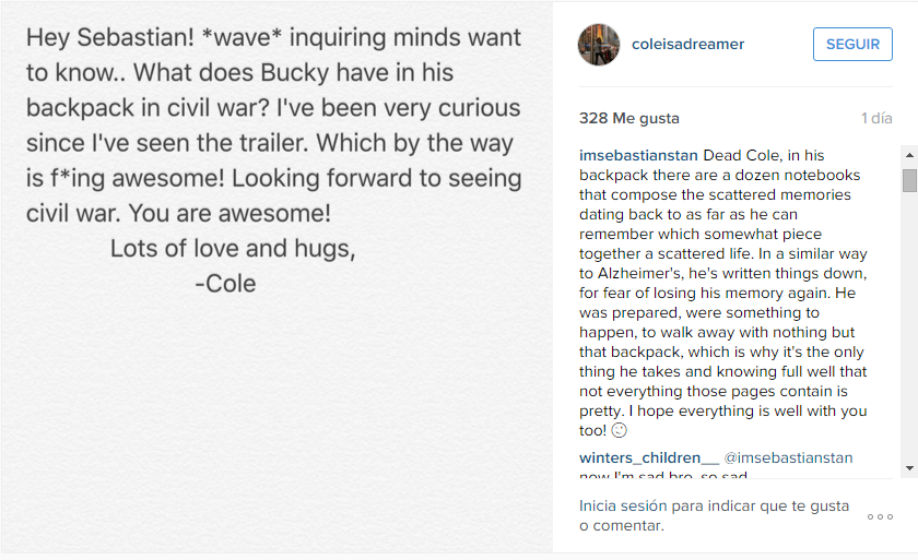 "En su mochila hay una docena de cuadernos que recomponen sus dispersos recuerdos, que se remontan tan lejos en el tiempo como puede recordar, para así de alguna forma reconstruir su vida", ha respondido Stan en una foto de Instagram de la usuaria Coleisadreamer. "De forma similar a lo que sucede con el Alzheimer, él ha escrito todo por miedo de volver a olvidarlo. Estaba preparado para salir corriendo por si sucedía algo, sólo acompañado de su mochila. Por eso, es lo único que se lleva, aun sabiendo que no todo lo que contienen esas páginas son memorias agradables".