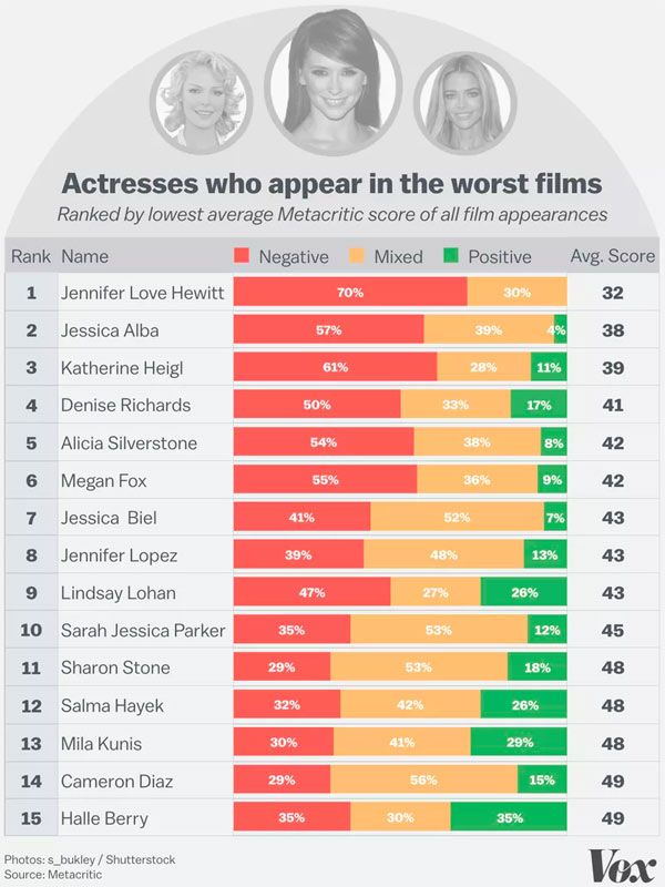 ¿Esperabas que Jennifer Love Hewitt encabezase la lista de actrices con la filmografía peor valorada? Curiosamente, la actriz alcanza hasta un 70% de críticas negativas. Le siguen Jessica Alba y Katherine Heigl, con un 38/100 y 39/100 de nota media, respectivamente.