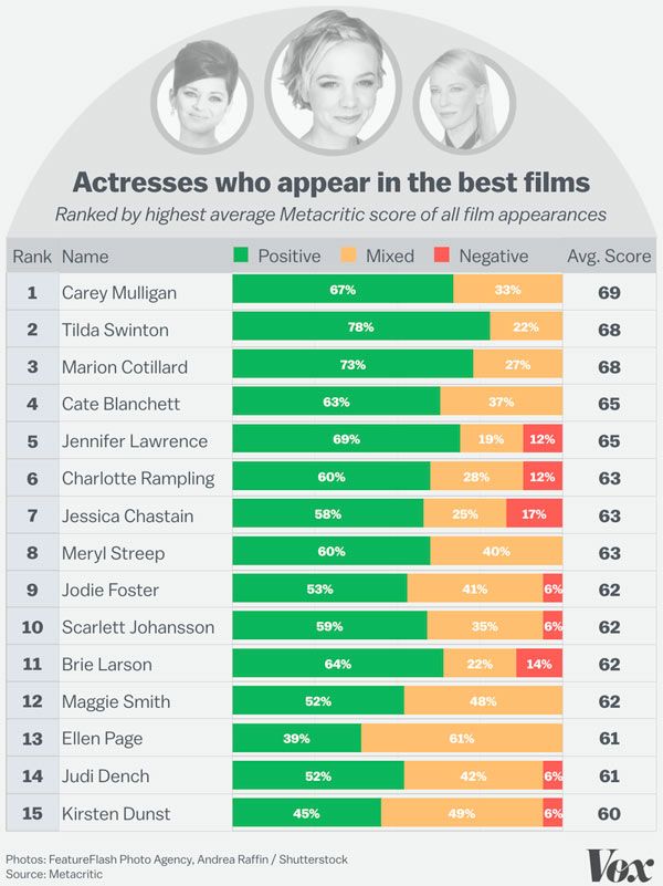 Carey Mulligan es la actriz con una nota media más alta en su filmografía, con un 69/100. Tilda Swinton, con un 78% de valoraciones positivas, está en el segundo puesto. Marion Cotillard le sigue de cerca con un 73% y un 68/100 de nota media. Tanto Swinton como Cotillard han ganado un Oscar, aunque Mulligan también ha estado nominada.