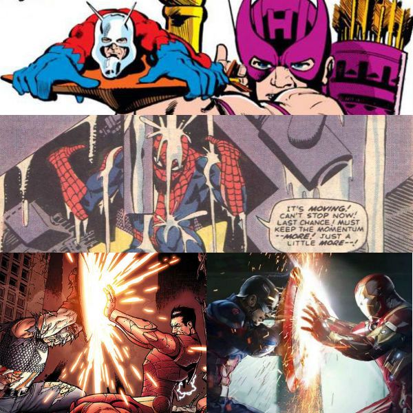 Aun cuando ha habido ciertas quejas por el escaso parecido que hay entre el filme de los hermanos Russo y la serie gráfica en la que supuestamente se inspira -sobre todo en lo referente a cómo se suavizan las connotaciones políticas de esta Guerra Civil-, no es difícil rastrear un gran amor por las viñetas originales en sus fotogramas. Así, la alianza entre Ojo de Halcón (Jeremy Renner) y Ant-Man durante la batalla del aeropuerto rememora la portada del #223 de Los Vengadores, al igual que el plano de Spider-Man tratando de resistir el peso de varios escombros por culpa del Capitán América se asemeja a una icónica viñeta del #33 de The Amazing Spider-Man, publicado en 1966.
