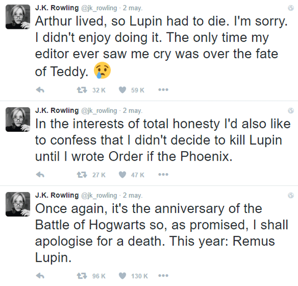 Este 2 de mayo, Rowling ha querido pedir perdón por matar a Lupin, a la par que ha explicado sus motivos. La autora argumenta que decidió matarle en Harry Potter y la Orden del Fenix: "Arthur vive, por lo que Lupin tenía que morir. Lo siento mucho, no disfruté de ello. La única vez que el editor me vio llorar fue cuando tuve que escribir el destino de Teddy [el hijo de Tonks y Lupin]".