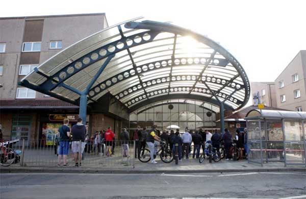 En estas primeras instantáneas puede verse al actor Ewen Bremner, quien da vida a Daniel 'Spud' Murphy, caminando de forma desgarbada por un conocido centro comercial de la ciudad. A pesar de la sencillez de la escena, ésta fue rodada cuatro veces antes de que Danny Boyle terminara dándola por buena.