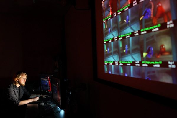 Una de las mayores obsesiones de Pixar pasaba por generar un entorno submarino que fuera lo más real posible o, en palabras del director "que el agua parezca sexy". Durante la visita, el jefe de iluminación nos explicó que los juegos entre luz y agua eran fundamentales. Cuando metemos un lápiz en un vaso, la imagen se distorsiona debido al fenómeno óptico de la refracción. Ya habían experimentado con líquidos en Ratatouille o Up, pero la inmensidad del océano lo complicaba todo.