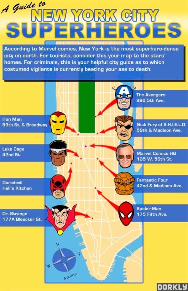 Nueva York es la ciudad clave en el mundo de superhéroes, ya que muchos se criaron en sus calles. Dorkly ha creado el mapa perfecto para conocer la Gran Manzana de mano de Capitán América, Nick Furia o Spider-Man.