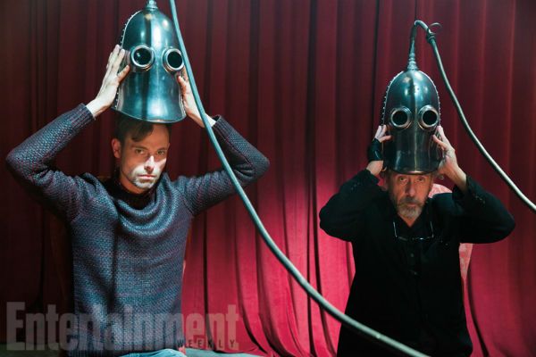 Tim Burton dirige a Samuel L. Jackson en la escena del 'flashback' en el laboratorio subterráneo de Barron. Están rodeados de un grupo de científicos que buscan la inmortalidad.