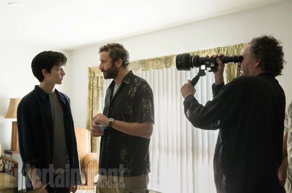 Tim Burton detrás del objetivo en busca del ángulo perfecto para rodar una escena entre Asa Butterfield (izquierda) y Chris O'Dowd (derecha).