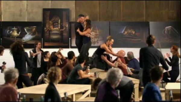 En la fotografía vemos a Evans bailando en lo que parece una de las míticas escenas de la película que transcurren en la taberna a la que Gastón es asiduo, pero si miras en la pared de atrás verás una serie de 'concept-art' de los diferentes personajes. La Sr. Potts, a quien presta su voz Emma Thompson, Chip, el armario interpretado por Audra McDonald, el piano a quien da vida Stanley Tucci y lo que parece el perro Sultán en la última imagen.